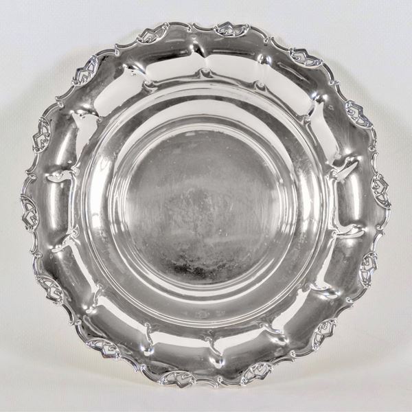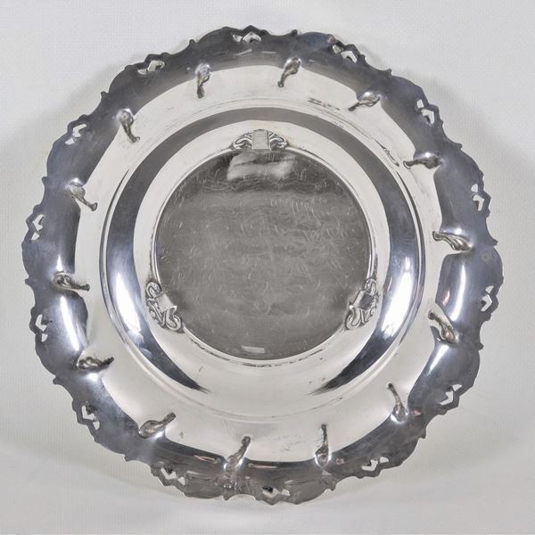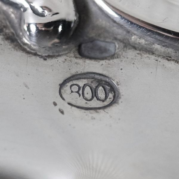 Small round centerpiece in silver with chiseled and embossed volute border, supported by three curved feet, gr. 245