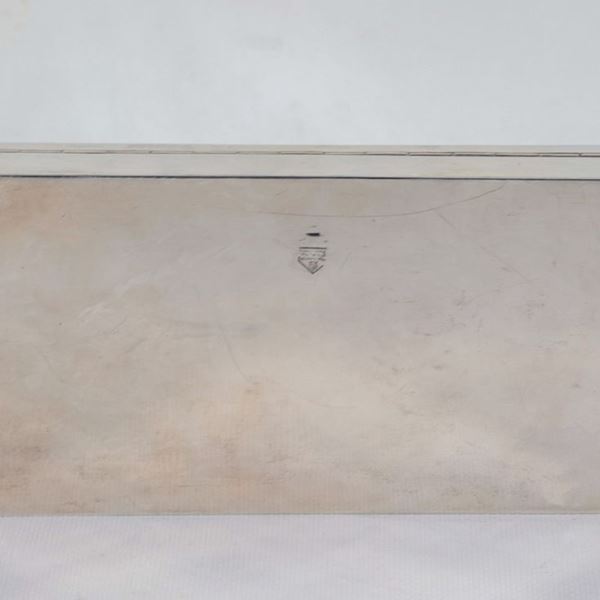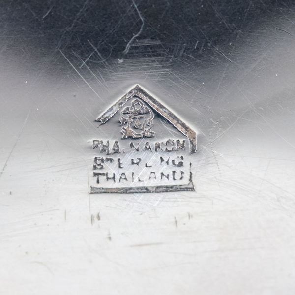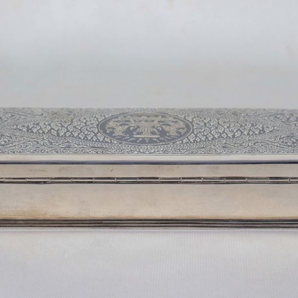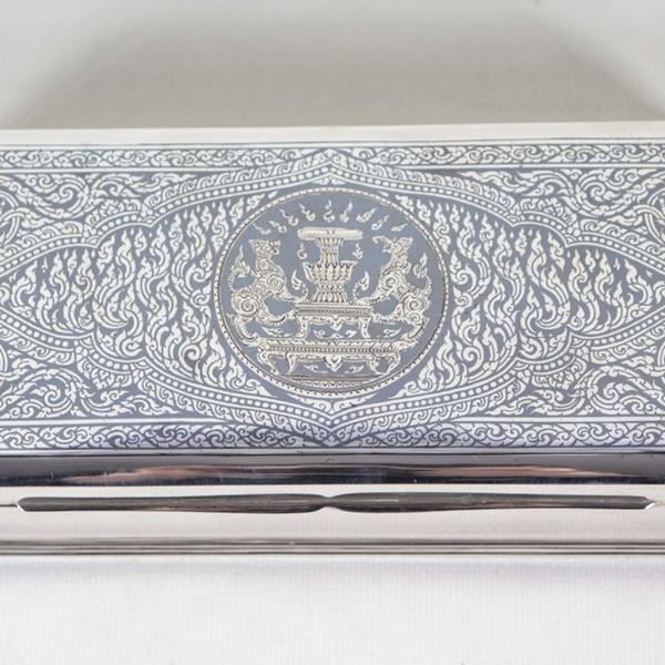 Thai box in silver and burr walnut with lid engraved with oriental motifs