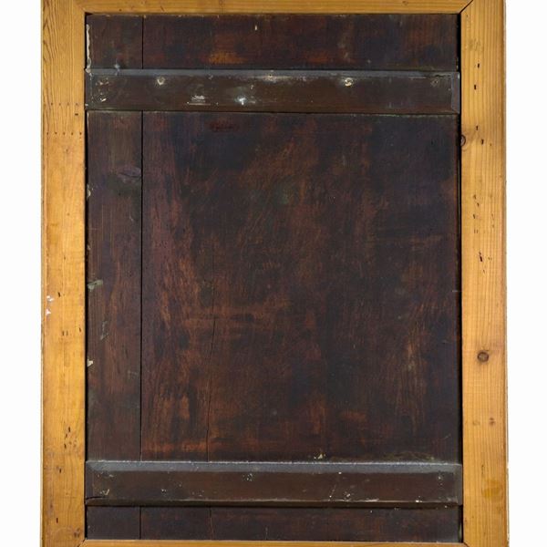 gilt and carved wooden frame. Defect on the panel, 73 x 52 cm.