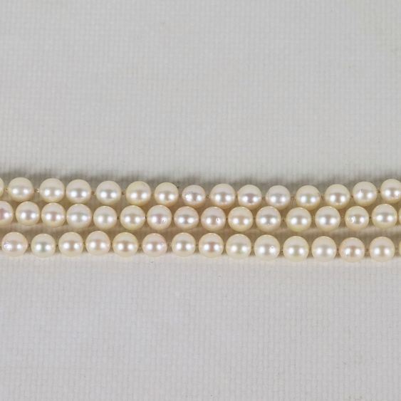 Three-strand cultured pearl bracelet with firmness in 18kt white gold with nine small diamonds and series of small rubies, 17 cm