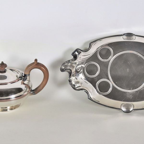 Antique lot in silver-plated metal of a teapot and an oval ribbed tray