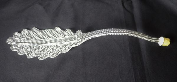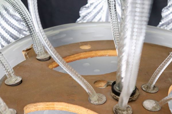 Chandelier in crystal and blown Murano glass in latex color with leaves in relief, 3 lights, one leaf missing