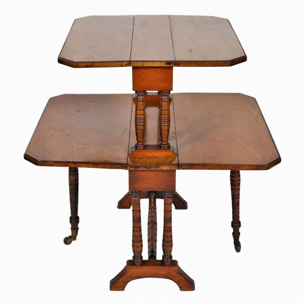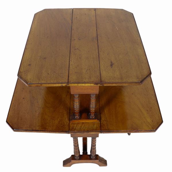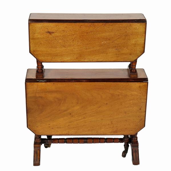 English Edwardian side table with two tops in blond mahogany, uprights and legs with turned columns
