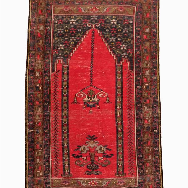 Kulah prayer carpet with a red background and borders with floral designs, M. 1.75 x 0.95.
