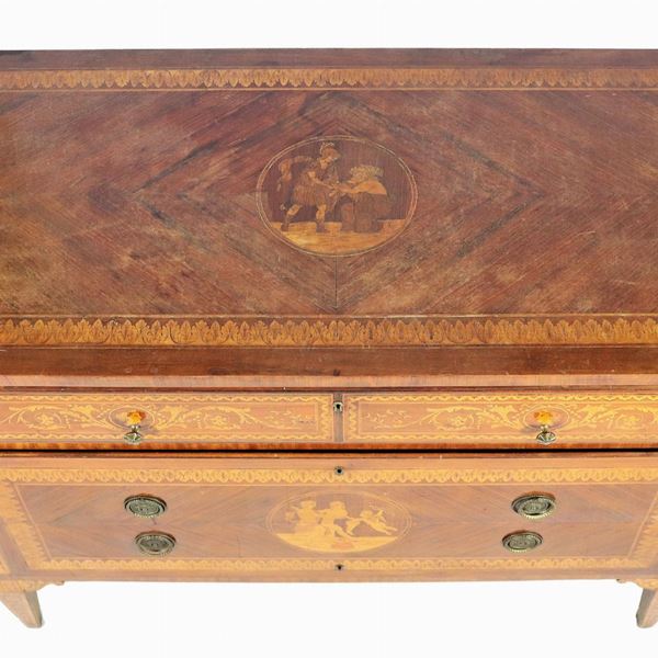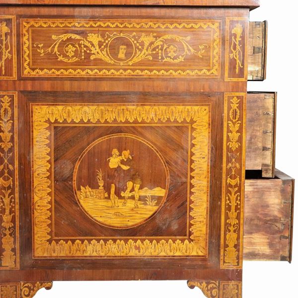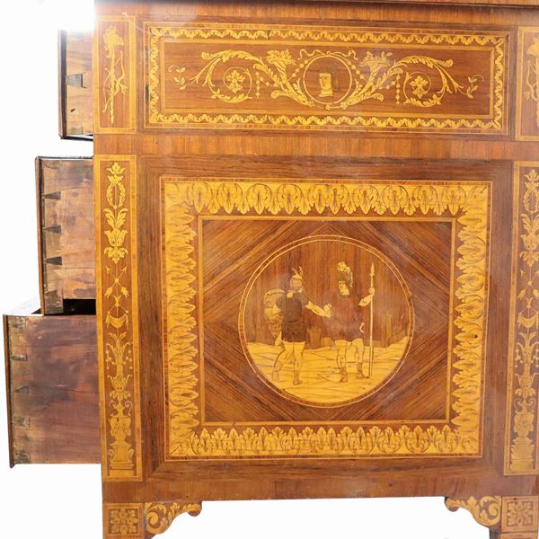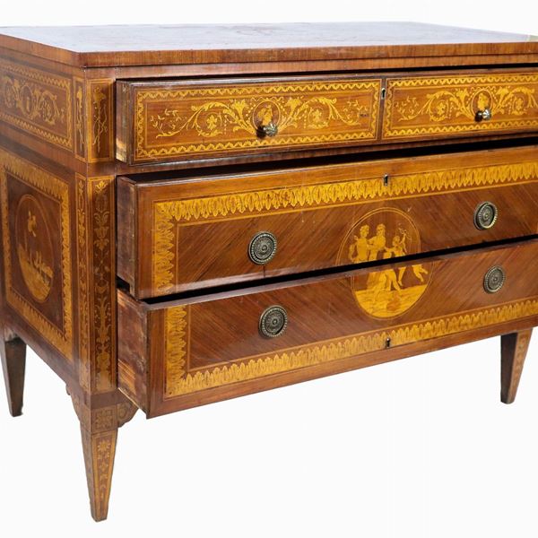 Lombardo chest of drawers of the Louis XVI line in walnut, purple ebony and bois de rose, with neoclassical inlays in the style of Maggiolini [..]