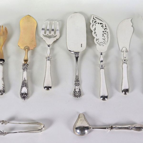 Lot of eleven antique silver-plated, embossed and chiselled serving cutlery. Some with silver-coated handles