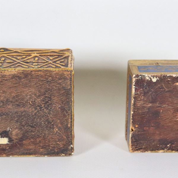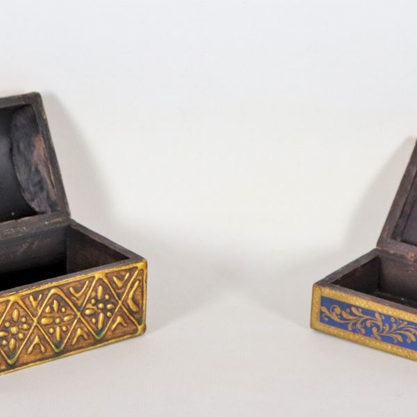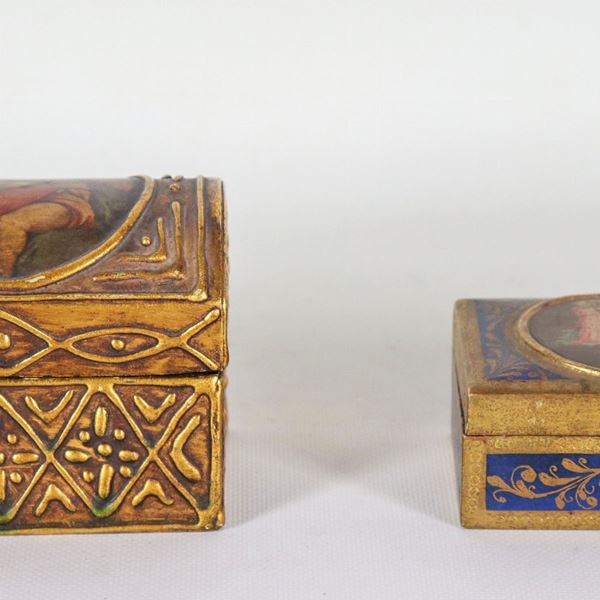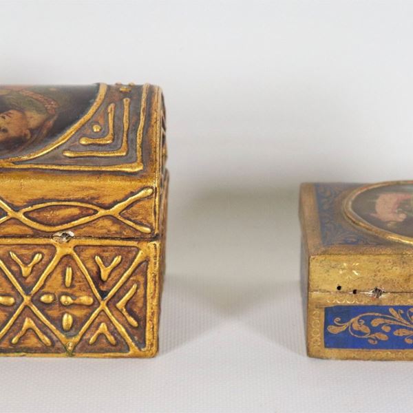 Lot of two gilded and painted wooden boxes, one rectangular and one in the shape of a trunk