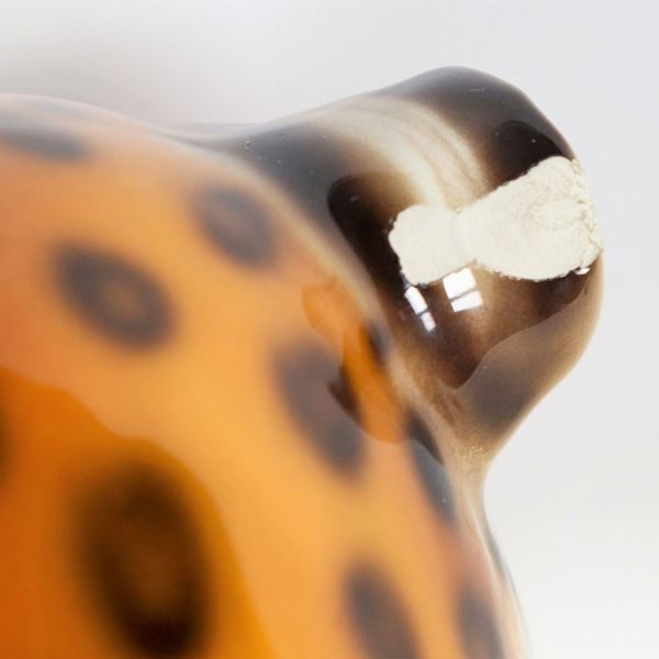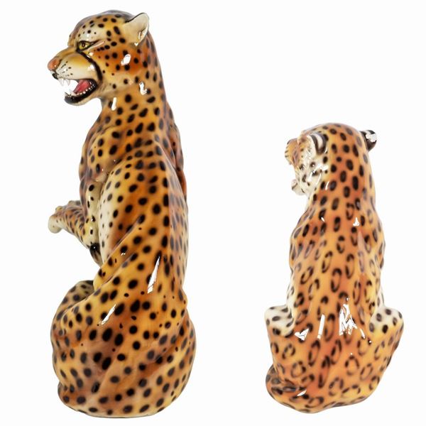 Lot of two sculptures in porcelain and glazed ceramic in various colors "Leopard" and "Leopard Cub"