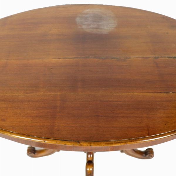 Louis Philippe oval coffee table in walnut, with faceted column base supported by four curved legs, defects on the top