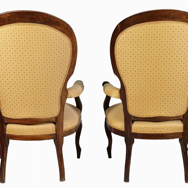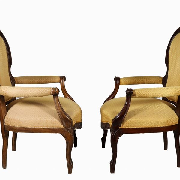 Pair of Louis Philippe armchairs in mahogany, with "trunk" backs and armrests and curved legs