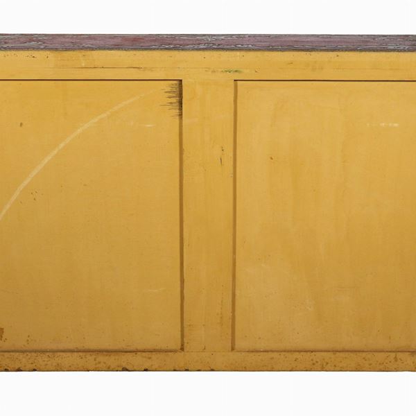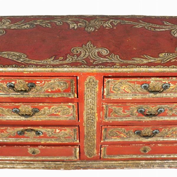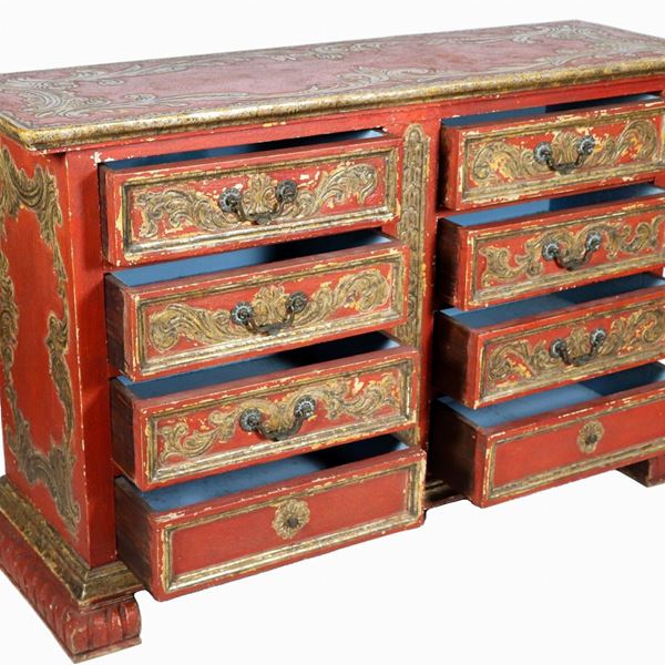 Spanish chest of drawers from the Louis XIV line in red lacquered wood with gilded relief carvings, eight drawers