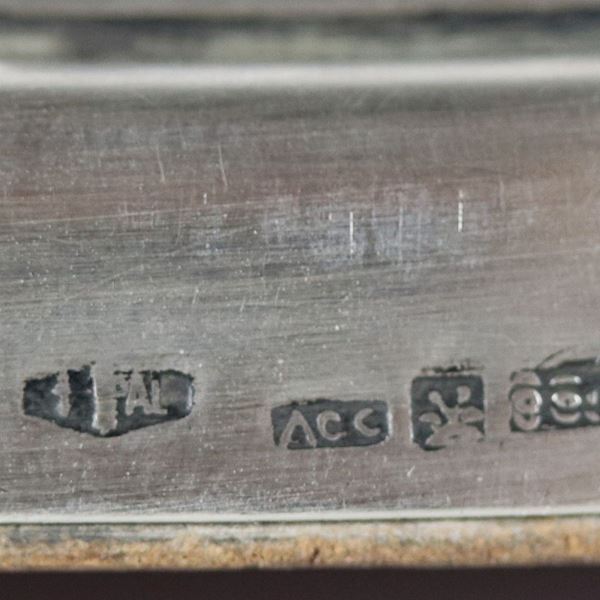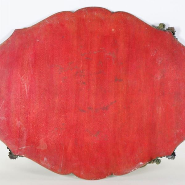 Centerpiece in chiseled and embossed silver with mirrored background and wooden base, missing a foot