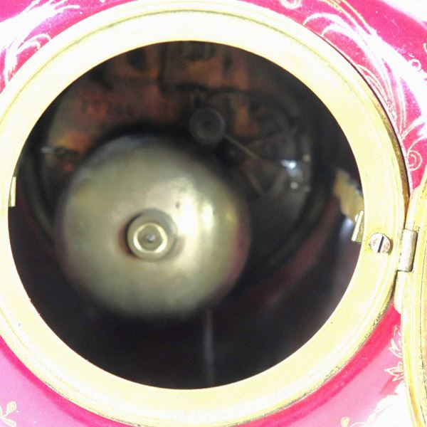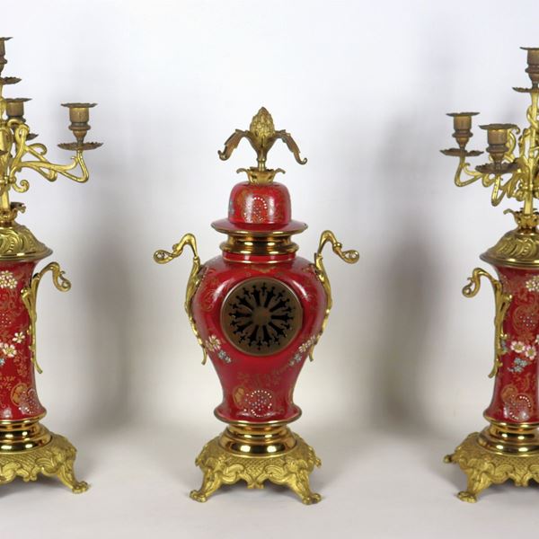 French Liberty triptych, clock and two five-flame candelabra, in gilded bronze, embossed and chiseled, covered with enamels with floral garland [..]
