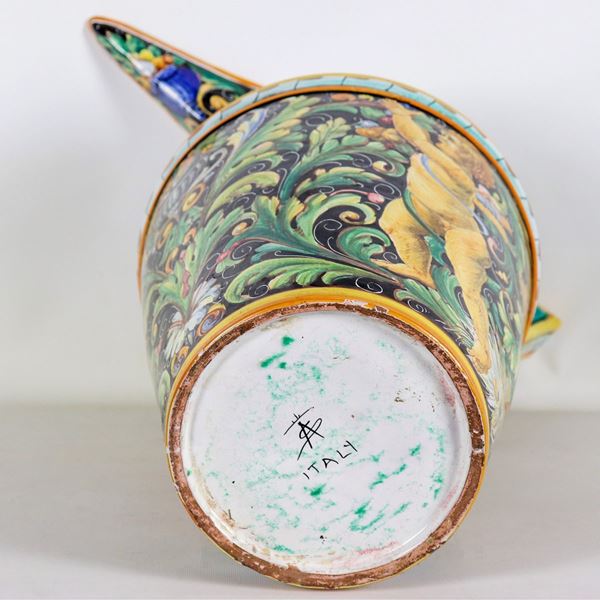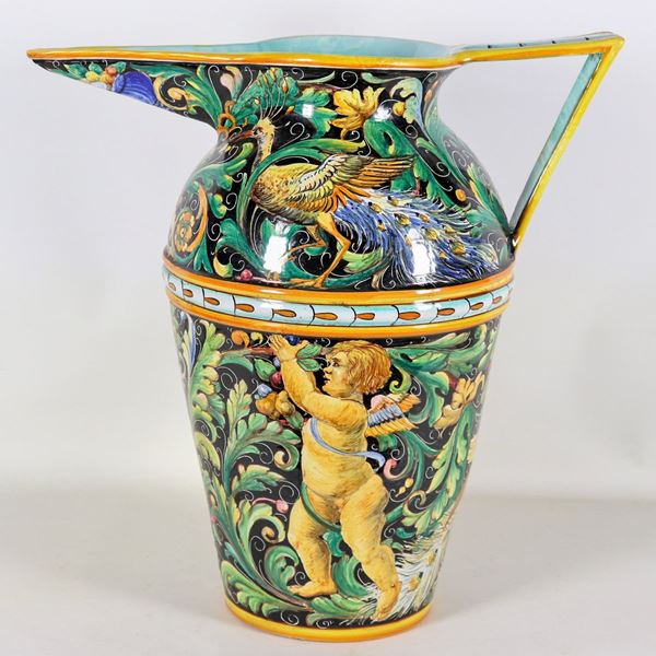 Large Gualdo Tadino glazed majolica jug signed Alfredo Santarelli (1874-1957), entirely decorated with cherubs, flowers and birds. Slight internal [..]