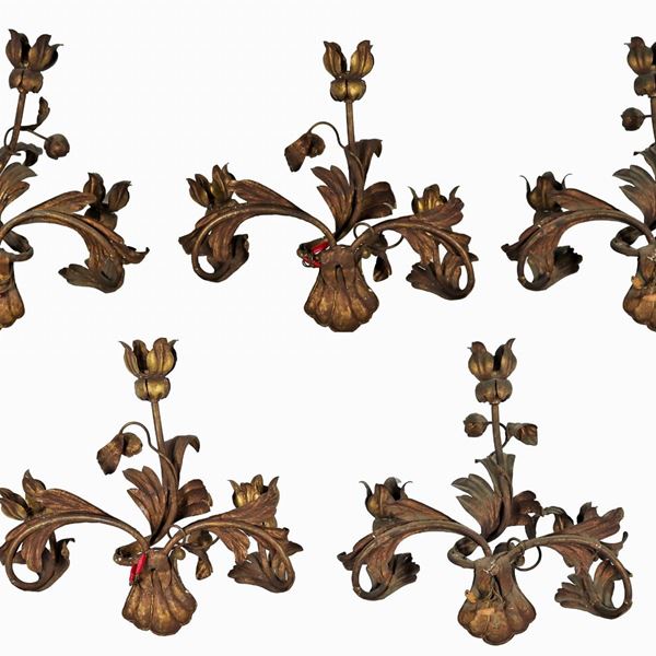 Lot of five gilded copper appliques with leaf and flower motifs, 3 lights each