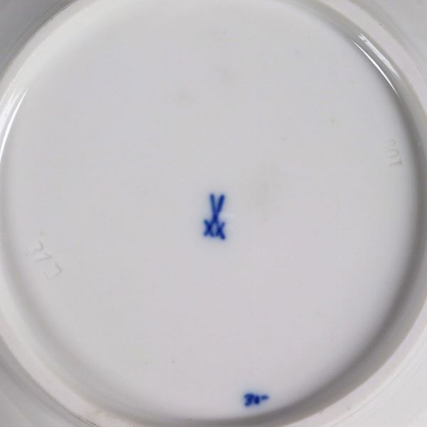 Lot of Meissen porcelain with onion decoration in cobalt blue on a white background: twenty dinner plates, two small square trays with perforated [..]