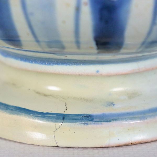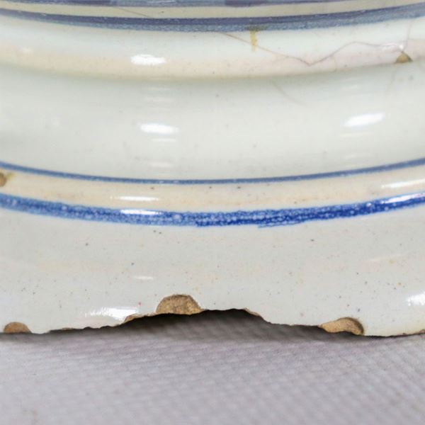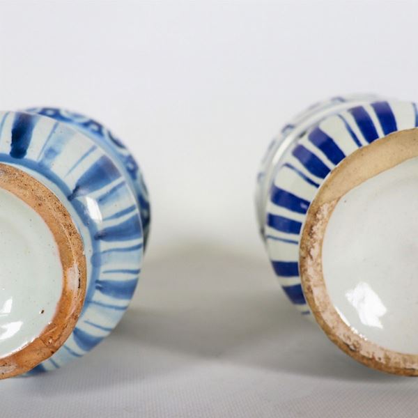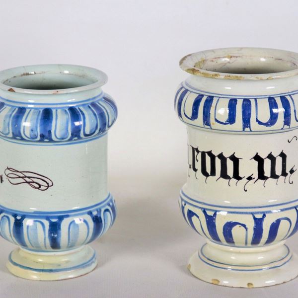 Lot of two Venetian majolica pharmacy albarelli, with blue and black decorations. Defects at the bases and at the edge of a neck
