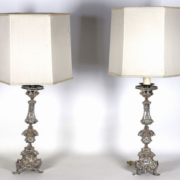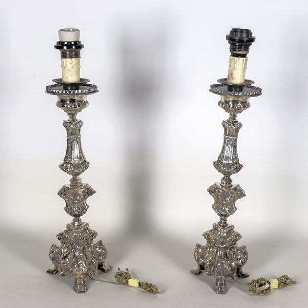 Pair of ancient Roman Louis XV torch holders in silvered, embossed and chiseled copper, conversion to electric light