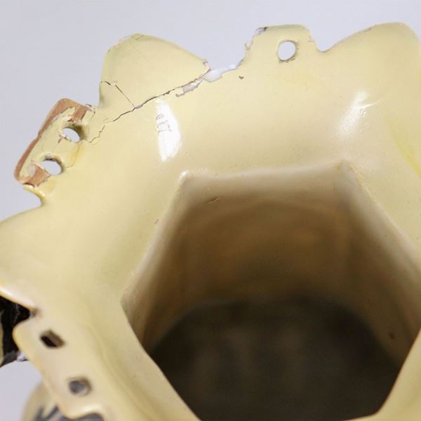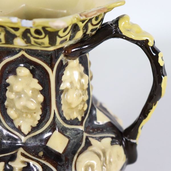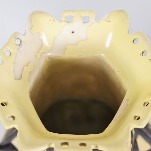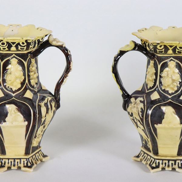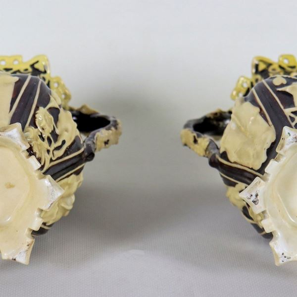 Pair of ancient small black porcelain vases, with light relief decorations with chinoiserie motifs. The necks of the vases are restored and [..]