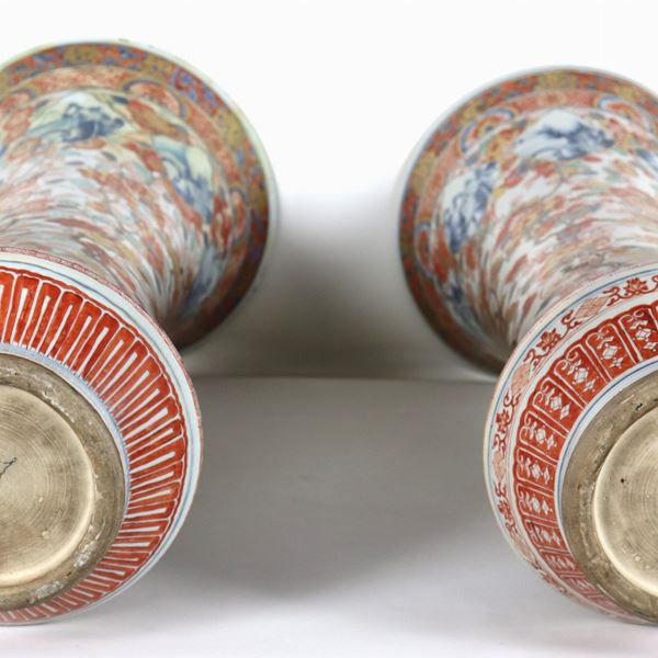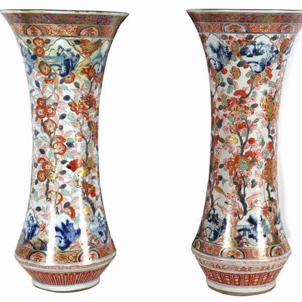 Pair of antique large Japanese trumpet vases in Imari porcelain, with polychrome enamel decorations in relief of exotic flowers and branches. [..]