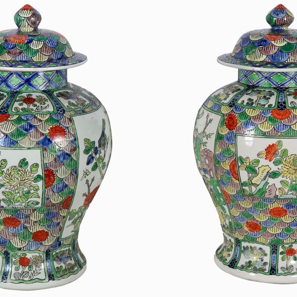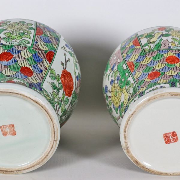 Pair of Chinese potiches in Family Green porcelain, with polychrome enamel decorations in relief with oriental flower motifs. One potiche is [..]