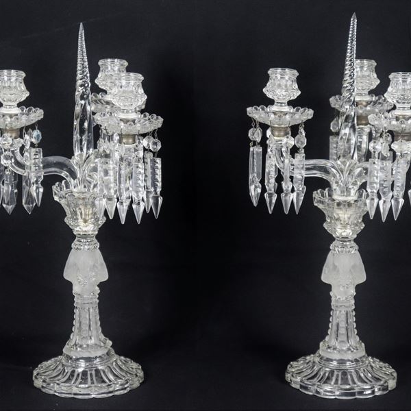 Pair of French candelabras in worked and engraved crystal, 3 flames each. Some slight defects in the pendants