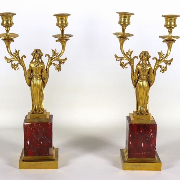 Pair of French doublers in gilded bronze and red French marble, with sculptures of Vestals and plaques with putti