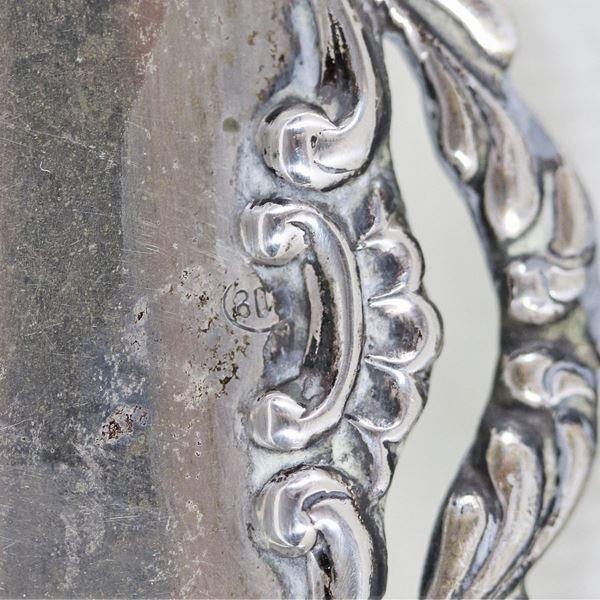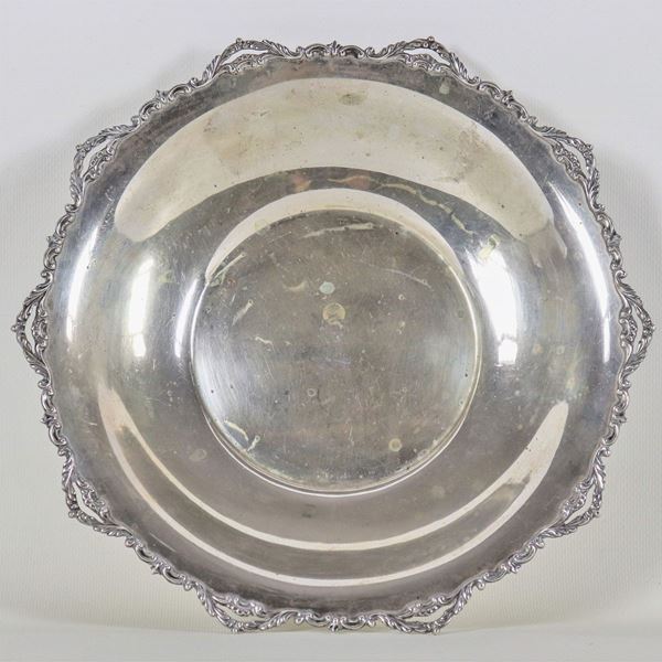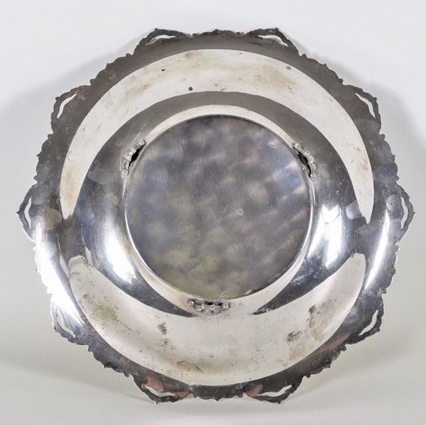 Round silver fruit bowl with chiselled and embossed edge, supported by three curved feet, gr. 320