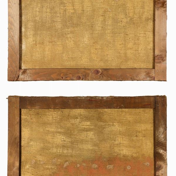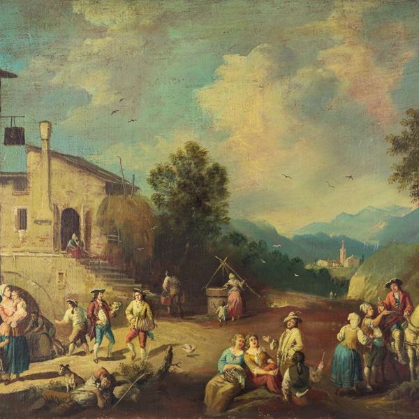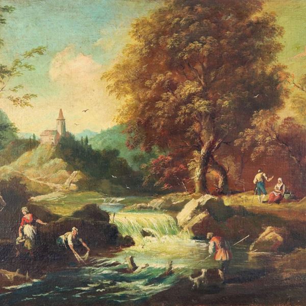Signed. 'Landscapes with washerwomen at the river and a village with commoners and knights', pair of oil paintings on canvas