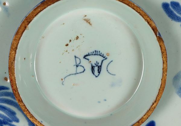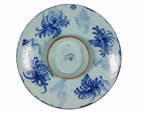 Ancient Ligurian majolica saucer with blue decoration depicting mythological figures, some lacks on the edge