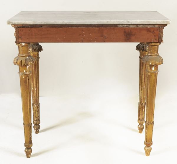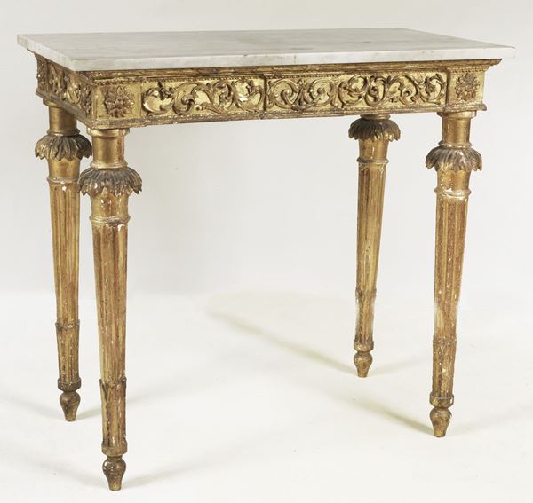 Ancient Roman Louis XVI console, in gilded wood carved with floral scrolls, acanthus leaves and rosettes, four fluted cone legs and gray marble [..]