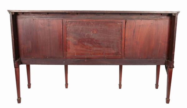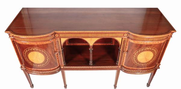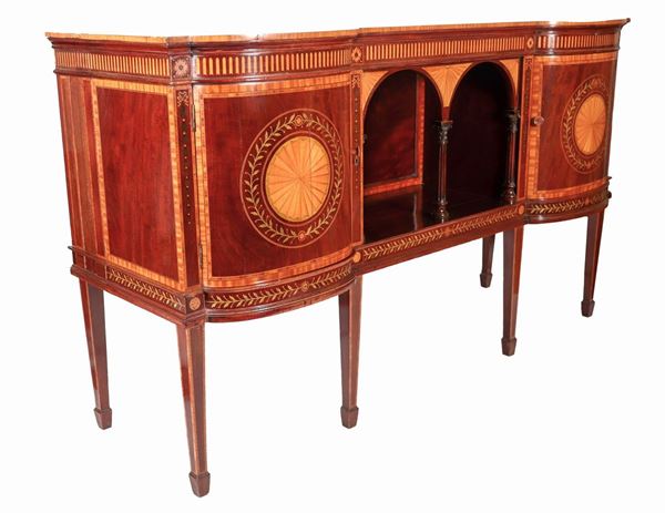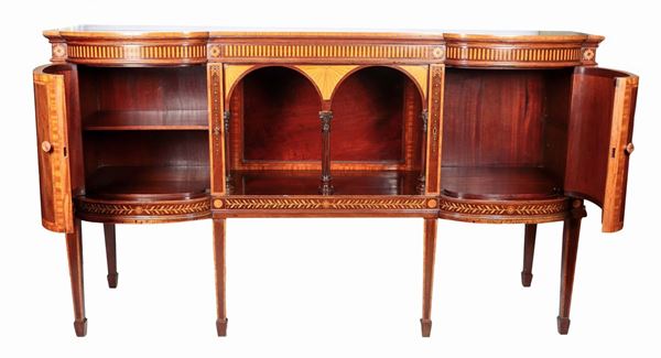 Antique English Sheraton servant in light mahogany and satinwood, with geometric thread inlays and fan-shaped medallions. The central part with [..]