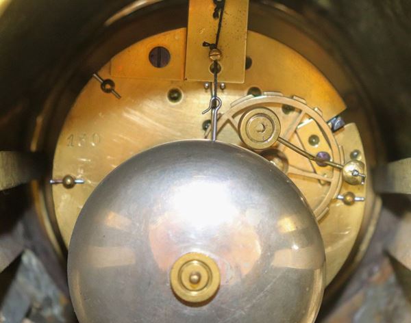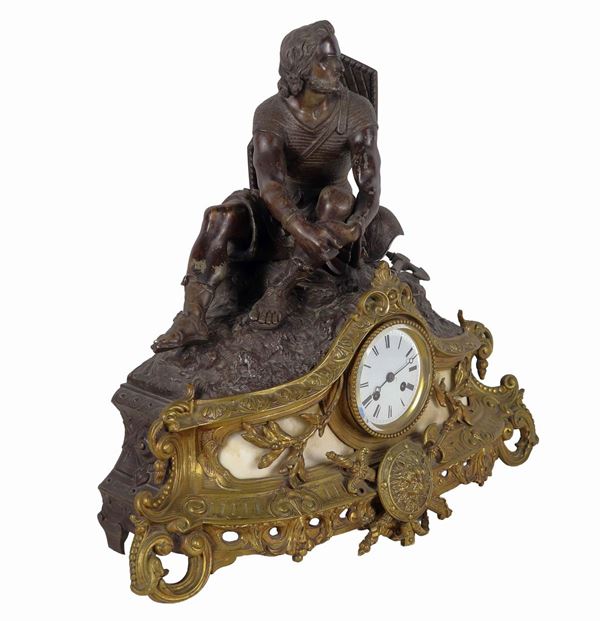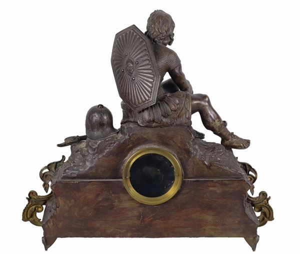 Antique French bronze and marble table clock with warrior sculpture, white enamel dial with Roman numerals. Second half of the 19th century. [..]