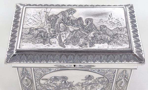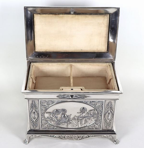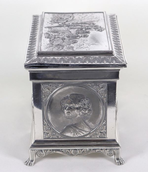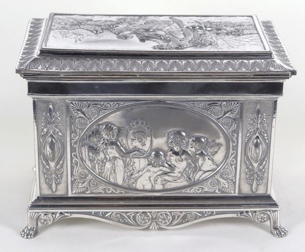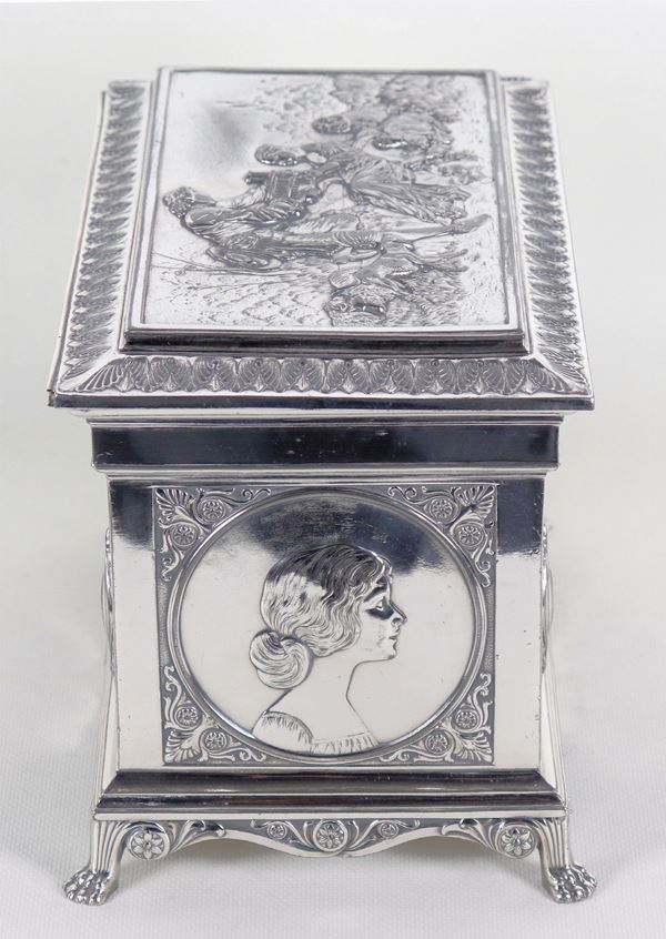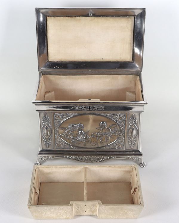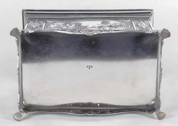 Antique German jewelery chest, marked WMF, in silvered metal and embossed with Empire motifs with bucolic scenes, allegories of cherubs and [..]