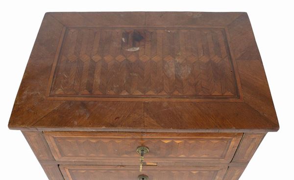 Antique Piedmontese Louis XVI bedside table in bois de rose and purple ebony, with geometric pattern inlays, two drawers and four legs in the [..]