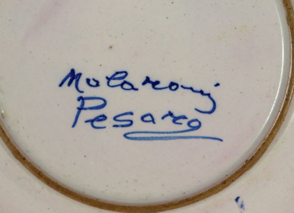 Blue Pesaro majolica saucer marked Molaroni (1908-1920), entirely decorated with motifs of caryatids and volutes, in the center medallion with [..]