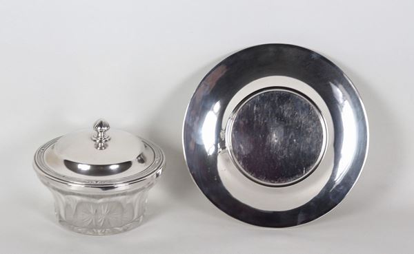 Cheese bowl with chased silver underplate and worked crystal tray, gr. 265