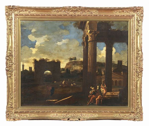Shop of. “Landscape with architecture, Roman ruins and characters”, fine oil painting on canvas