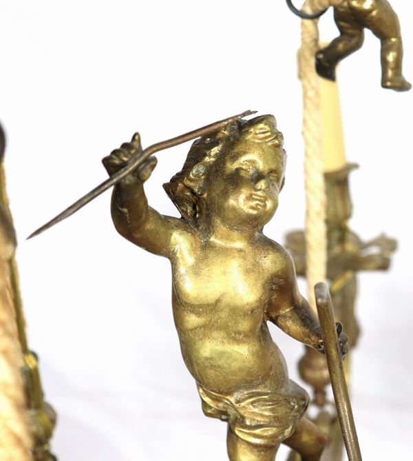 Gilded bronze chandelier with sculptures of putti and volutes, 8 lights