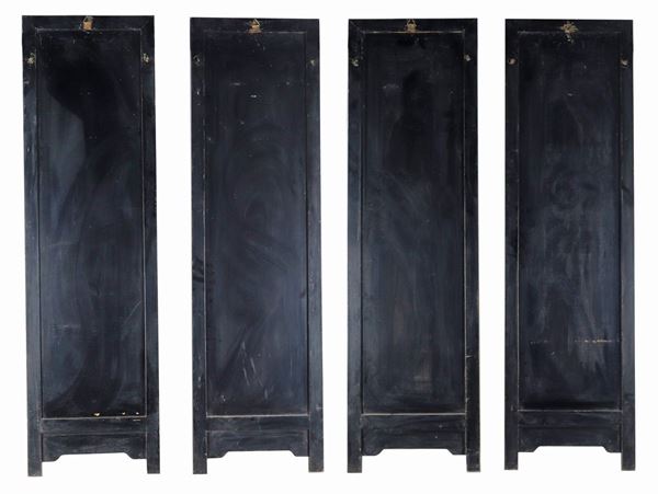Lot of four Japanese panels in ebonized wood decorated in relief with jades and semiprecious stones with motifs of oriental flowers and birds [..]