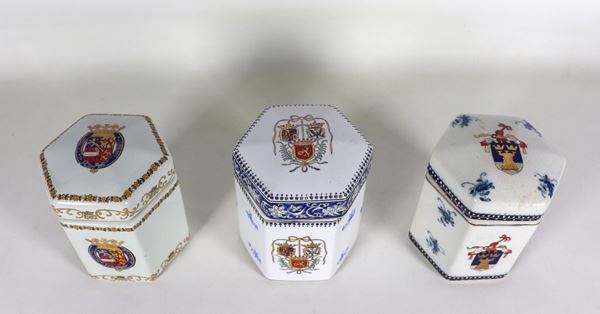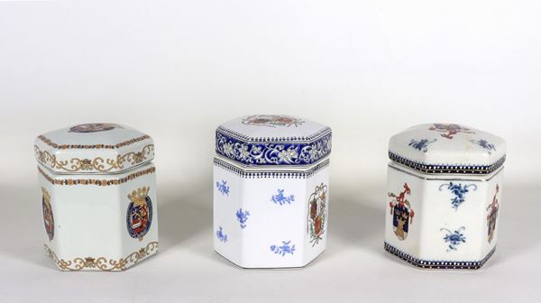 Lot of three hexagonal porcelain jars, with enamel decorations in relief of coats of arms and blue flowers