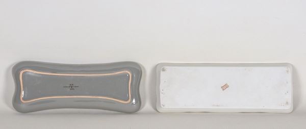 Lot of two rectangular porcelain pen trays with various decorations, different shapes and sizes