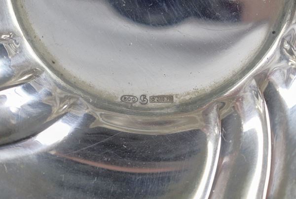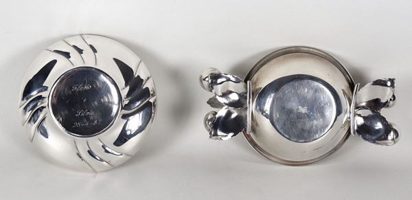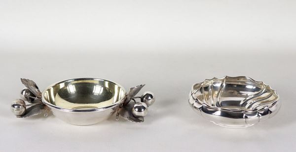 Lot of two round bowls in chiselled and embossed silver, one with handles in the shape of bunches of cherries, gr. 290