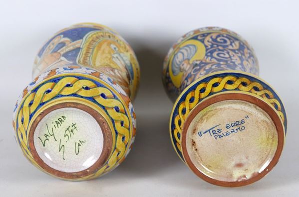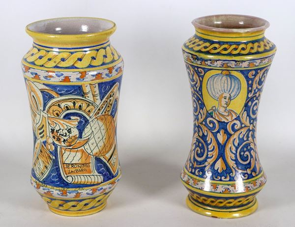 Lot of two Sicilian majolica albarelli with colorful decorations, in the center figures of "Man with turban" and "Man with hat"