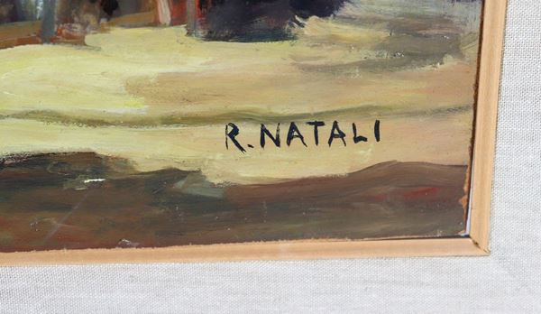 Signed. "Glimpse of Livorno with sailors and girls playing the guitar", oil painting on masonite