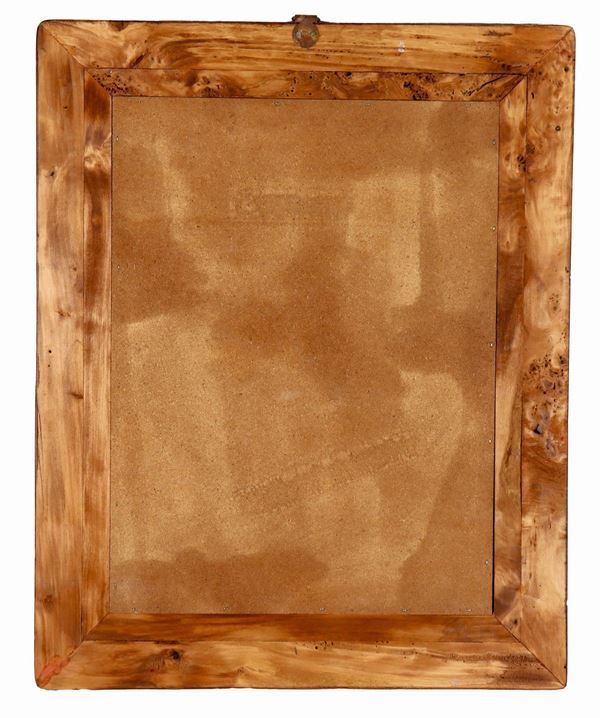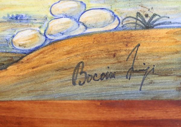 "Nobleman hunting with a falcon", large polychromed Deruta majolica tile, signed Luigi Boccini (Deruta 1939-?), founder of the "Boccini Majoliche [..]