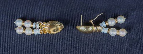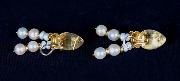 Pair of 18K yellow gold pendant earrings with a series of pearls, gr. Approximately 14, length 5 cm