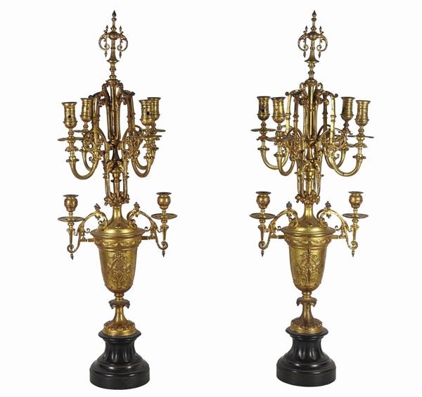 Pair of antique French candelabra in gilded bronze, embossed and chiselled, supported by black marble bases, 6 flames each