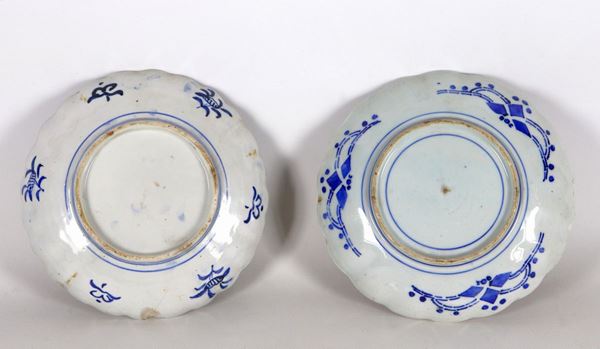 Pair of antique Japanese plates in Imari porcelain, with colorful decorations with oriental flower and leaf motifs, curved edges