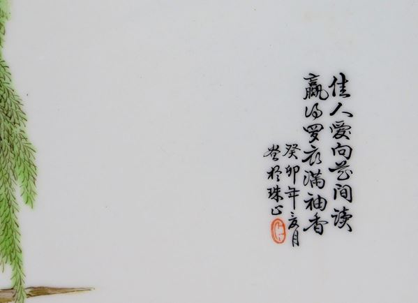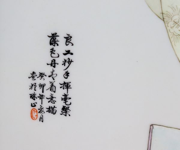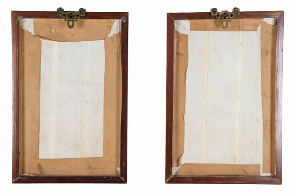 Pair of Chinese enamelled porcelain plaques, with enamel decorations in relief with motifs of oriental life scenes, walnut frames